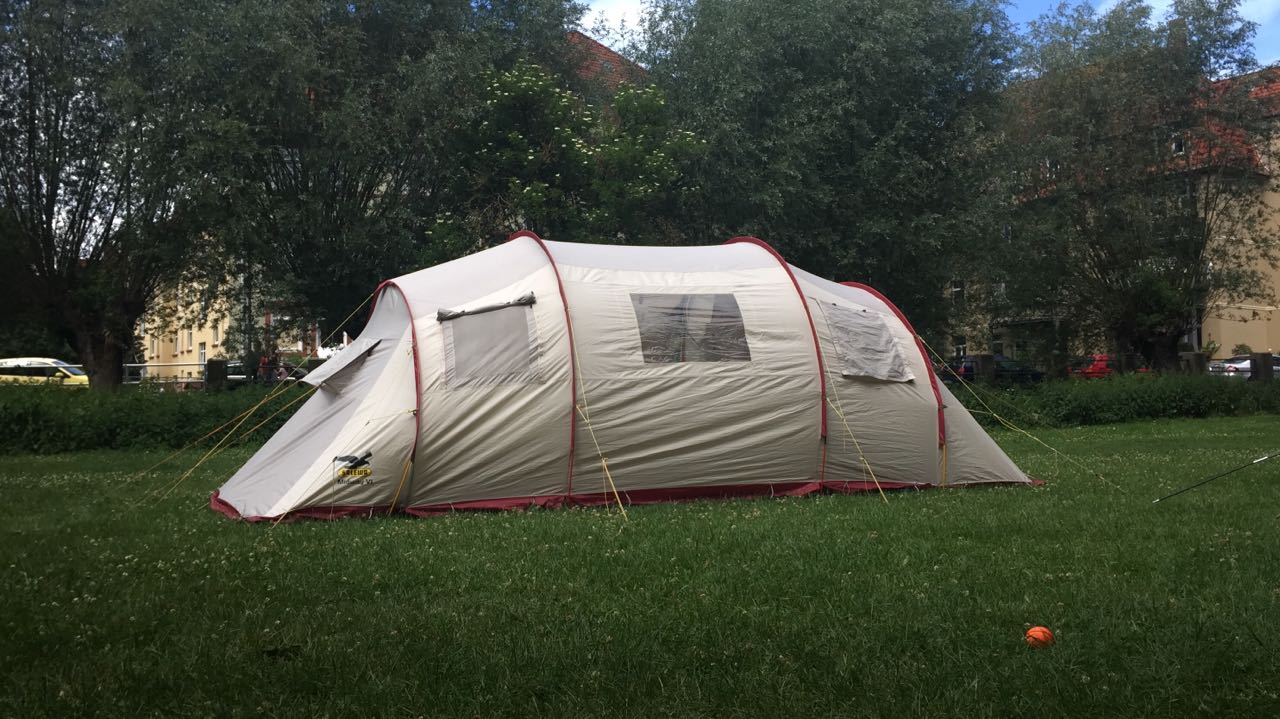 Angekommen in Göttingen gab es nach dem langen Sitzen im ICE erst einmal einen knackigen Fußmarsch zum „Zeltplatz“, der es mit Gepäck doch ganz schön in sich hatte. Durchgeschwitzt angekommen war keine Zeit zu verlieren und die Zelte mussten schnell aufgebaut werden. Bis zu den ersten Spielen war es nicht mehr lange hin, da es jedoch bei den meisten an Zelterfahrung mangelte (auch bei Aleks und Dejan) kam es zu Komplikationen im Aufbau -Arbeitsteilung- Dejan coachte, Aleks kämpfte weiter mit den Zelten.