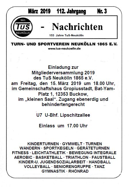 Einladung zur Mitgliederversammlung 2019 des TuS Neukölln 1865 e.V.