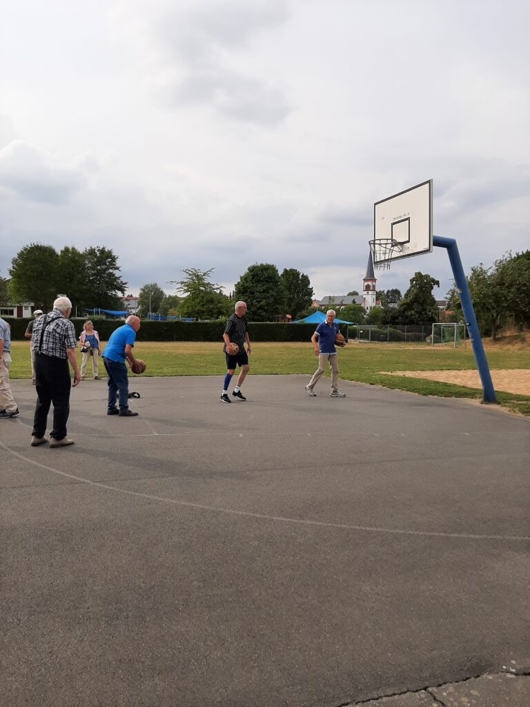 Auf diesem legendären Freiplatz wurde ein Freiwurfwettbewerb durchgeführt (vor der Weinprobe), den der Organisator der nächsten Ü70 DM 2023 in Gießen, Horst Wiegard, gewann. Am Sonntag vormittag dann trafen sich um 10 Uhr 5 (!) Spieler der Gründergeneration (im Bild in roter Spielerkleidung), darunter auch der Verfasser dieses Artikels, sowie einige etwas jüngere Spieler des gastgebenden Vereins BC Darmstadt, um vor einer größeren Zuschauerkulisse ihre noch zweifellos vorhandenen basketballerischen Fähigkeiten zu demonstrieren. Das Spiel über 4 x 10′ durchlaufende Zeit endete unentschieden. Es hat allen Beteiligten großen Spaß gemacht, keiner verletzte sich und so verabschiedeten sich alle Teilnehmer und Zuschauer, um noch den wirklich sonnigen Sonntag nachmittag zu genießen.