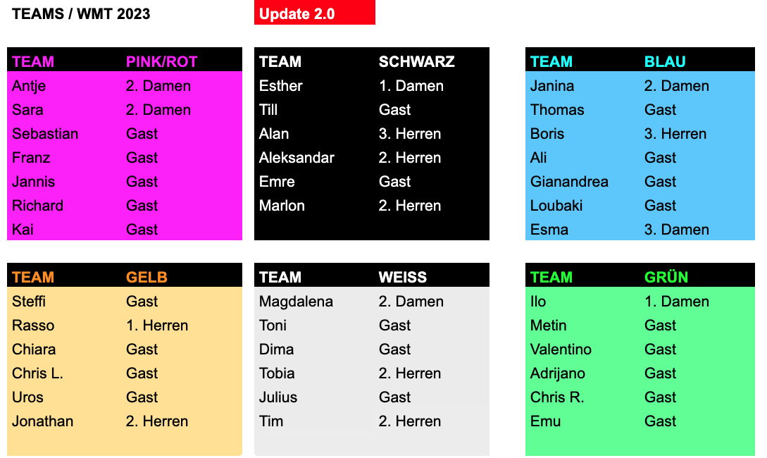 Bitte bringt ein Trikot/Shirt ein Eurer Teamfarbe mit!